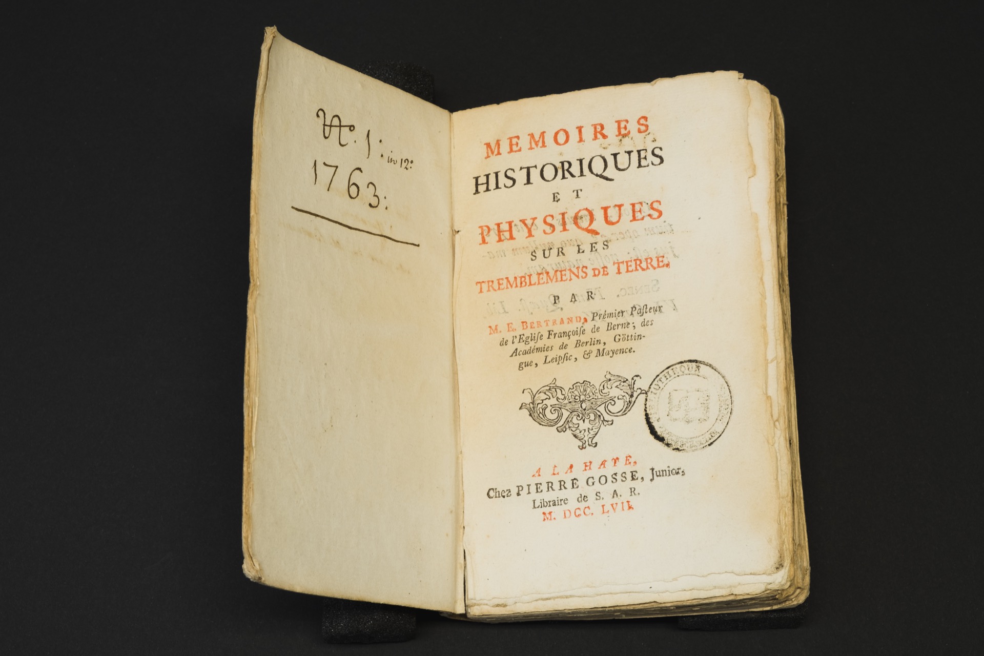 Mémoires historiques et physiques sur les tremblemens de terre. Elie Bertrand. A La Haye : chez Pierre Gosse, junior, 1757. BPY 305