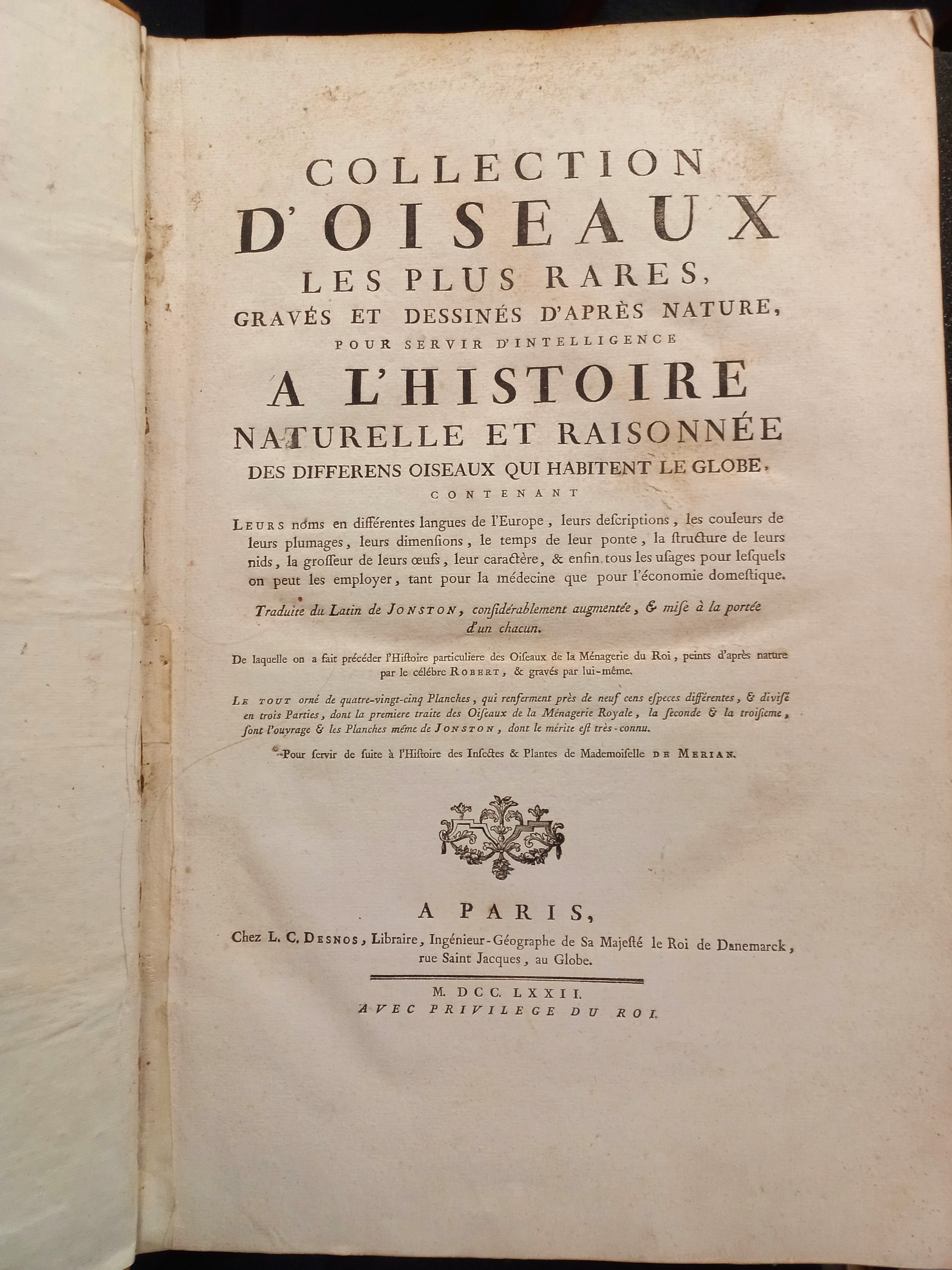 Traduite du latin de Jonston, considérablement augmentée, et mise à la portée d'un chacun : de laquelle on a fait précéder l'histoire particulière des oiseaux de la ménagerie du Roi, peints d'après nature par le célèbre Robert, et gravés par lui-même, le tout orné de quatre-vingt-cinq planches, qui renferment près de neuf cens espèces différentes, et divisé en trois parties, dont la première traite des oiseaux de la Ménagerie royale, la seconde et la troisième, sont l'ouvrage et les planches même de Jonston, dont le mérite est très connu : pour servir de suite à l'Histoire des insectes et des plantes de mademoiselle de Merian