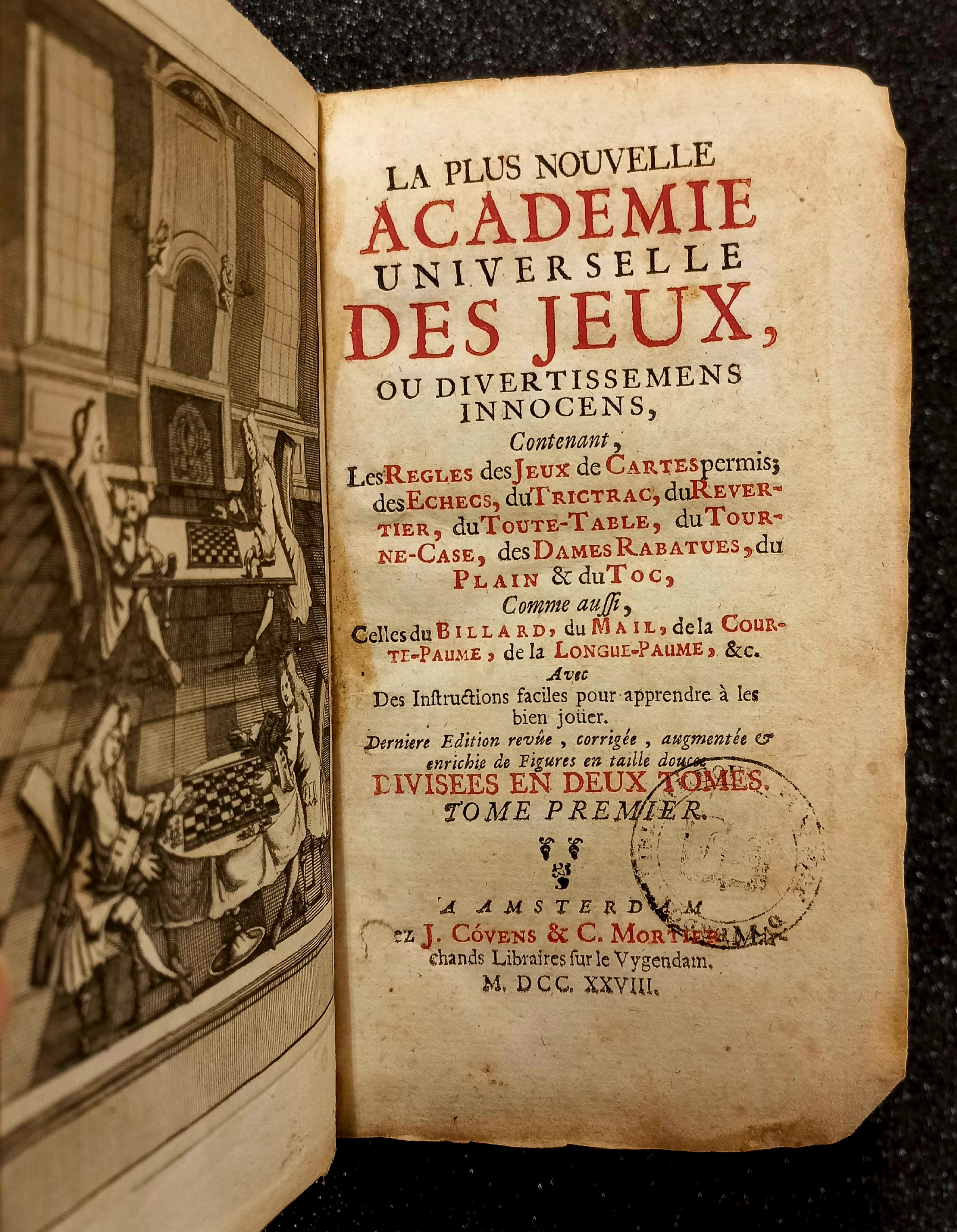 La plus nouvelle académie universelle des jeux, ou divertissemens innocens : contenant, les règles des jeux de cartes permis, des échecs, du trictrac, du revertier, du toute-table, du tourne-case, des dames rabatues, du plain et du toc, comme aussi, celles du billard, du mail, de la courte-paume, de la longue-paume, etc. : avec des instructions faciles pour apprendre à les bien jouer : divisées en deux tomes